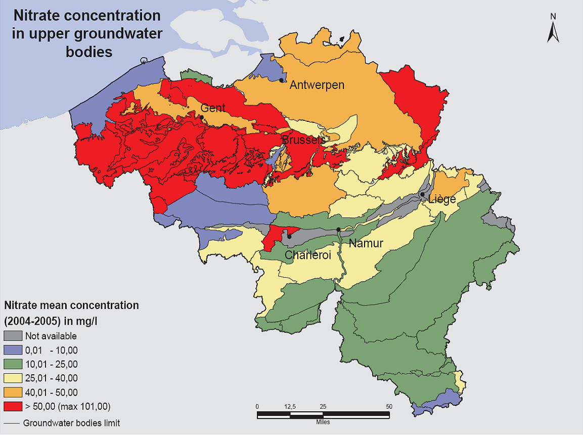 Figure 1 : Nitrate concentration in upper groundwater bodies in Belgium