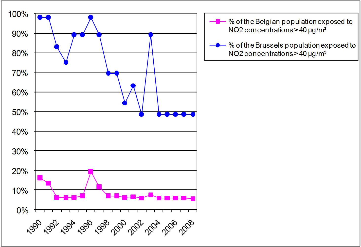 Percentage of the Belgian and the Brussels population potentially exposed to NO2 concentrations above the annual limit value (40 µg/m³). This limit value entered into force on 01/01/2010